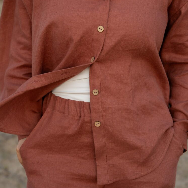 Katrs apģērbs top mūsu ģimenes darbnīcā – ar rūpēm un bez liekiem krājumiem. Kvalitatīvs roku darbs un dabisks audums.